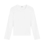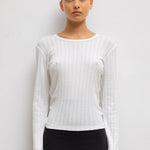 - Details: Subtle stretch, ribbed pointelle relaxed long sleeve, with a crew-neck, hip-length body, and scallop edging around the neckline and cuffs