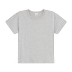 - Details: Short sleeve, boxy crew neck tee with a hip-length body