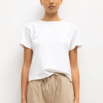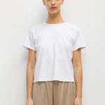 The Margo Tee by Leset in white offers a fresh, sculpted take on the everyday tee. Cut for a boxy and cropped fit in a crisp cotton fabric with just the right amount of weight and breathability. Understated but intentionally polished for effortless style. Wear with vintage tailored pants and an oversized knit for a polished work look.
