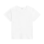 - Details: Short sleeve, boxy crew neck tee with a hip-length body