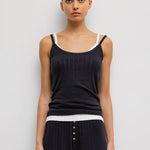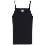 - Details: Subtle stretch, ribbed pointelle tank with a scallop detailed dropped round neckline, longline body, and scallop detailed thin spaghetti straps