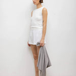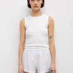 Leset’s Pointelle Sleeveless Crew blends soft structure with delicate detail, thanks to its ribbed pointelle cotton and subtle scalloped trim. The close, cropped fit flatters without clinging, offering all-day ease with a feminine edge and quiet charm. The fine knit offers coverage while keeping things airy and refined. Style it with straight-leg jeans, a leather belt, and sneakers for a crisp, casual city look.