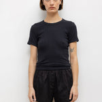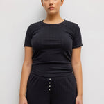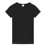 - Details: Subtle stretch, ribbed pointelle relaxed tee, with a crew-neck, hip-length body, and scallop edging around the neckline and armholes