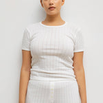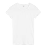 - Details: Subtle stretch, ribbed pointelle relaxed tee, with a crew-neck, hip-length body, and scallop edging around the neckline and armholes