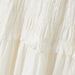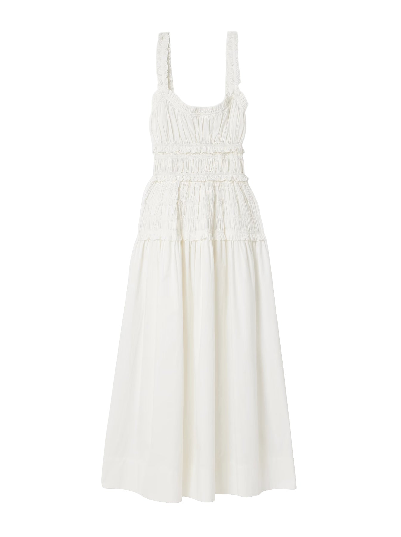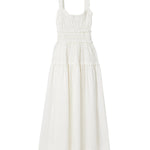 The Marianne Dress from DÔEN is timeless and refined in a white cotton poplin. Featuring a square neckline paired with softly gathered detailing at the bust and a sculpted bodice with delicate ruffles. The silhouette transitions seamlessly from a fitted waist to a generously gathered panel that flows into a full-length skirt. Perfect for elevating your everyday wardrobe with understated elegance.
