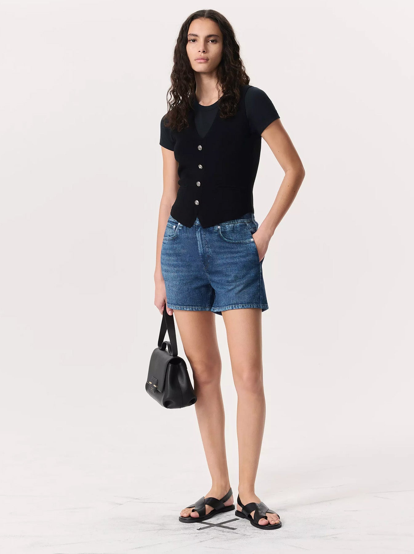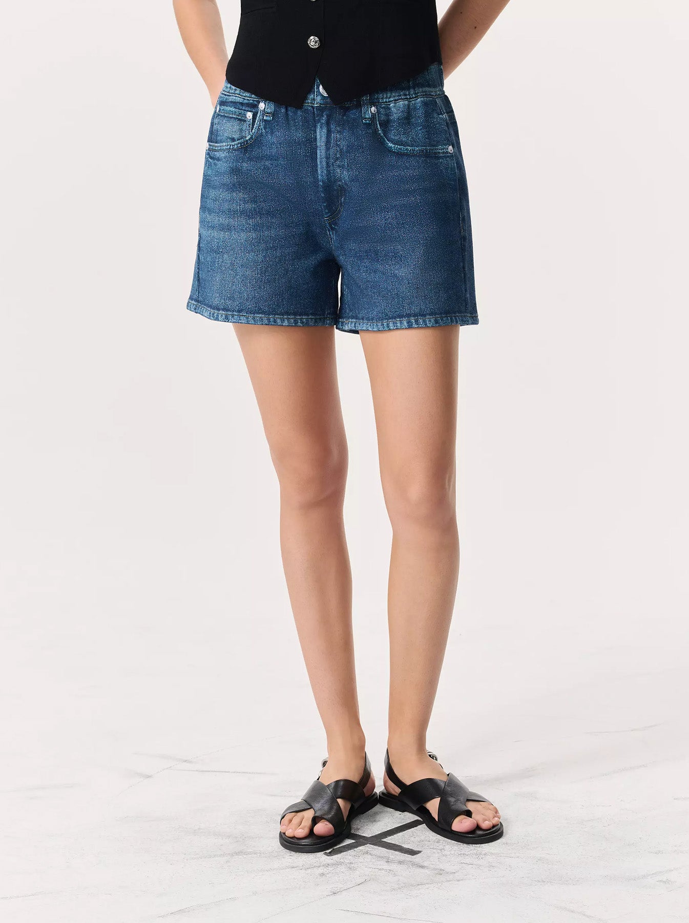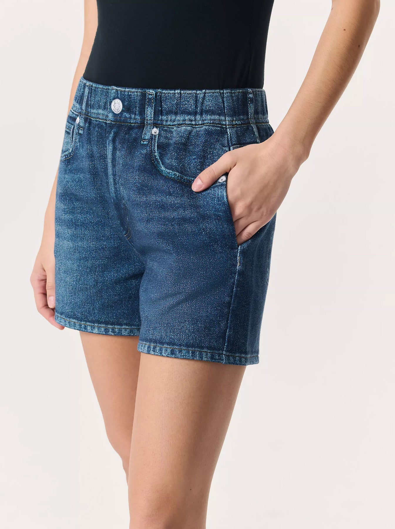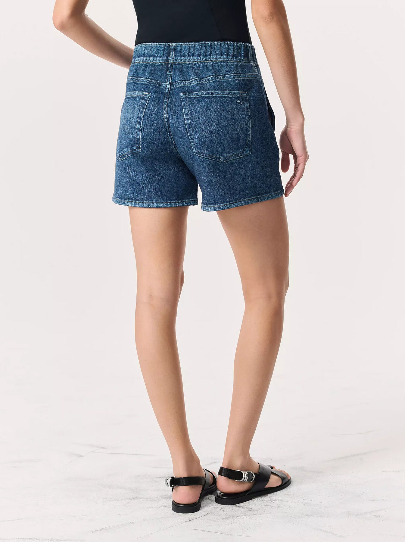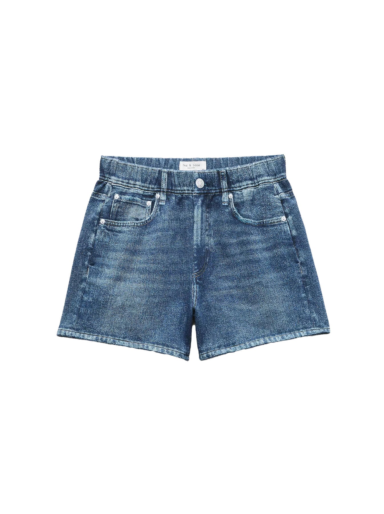 Rag & Bone's walking shorts are made from cotton terry cloth, offering a plush interior while showcasing a denim-like print on the exterior. Designed with a 4" inseam and a pull-on elastic waistband, this mid-rise style ensures exceptional comfort. These shorts also feature concealed side-seam pockets alongside digitally printed denim pockets and details, giving them the feel of classic jean shorts.