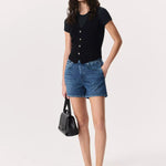Details: Side seam pockets, printed denim pockets with button and details, mid-rise, elasticated waist, clean hem