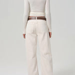 - Details: Mid to High rise, classic 5 pockets, belt loops, clean full-length hem with slight barrel leg, monotone stitching, rigid denim