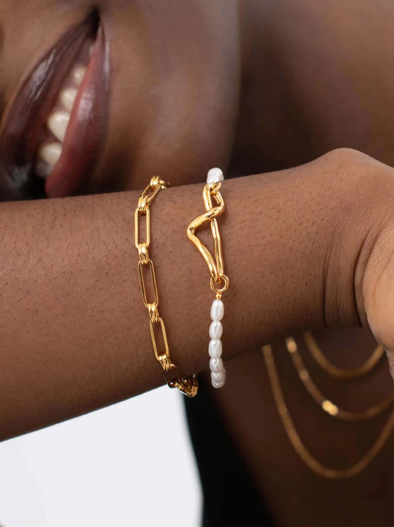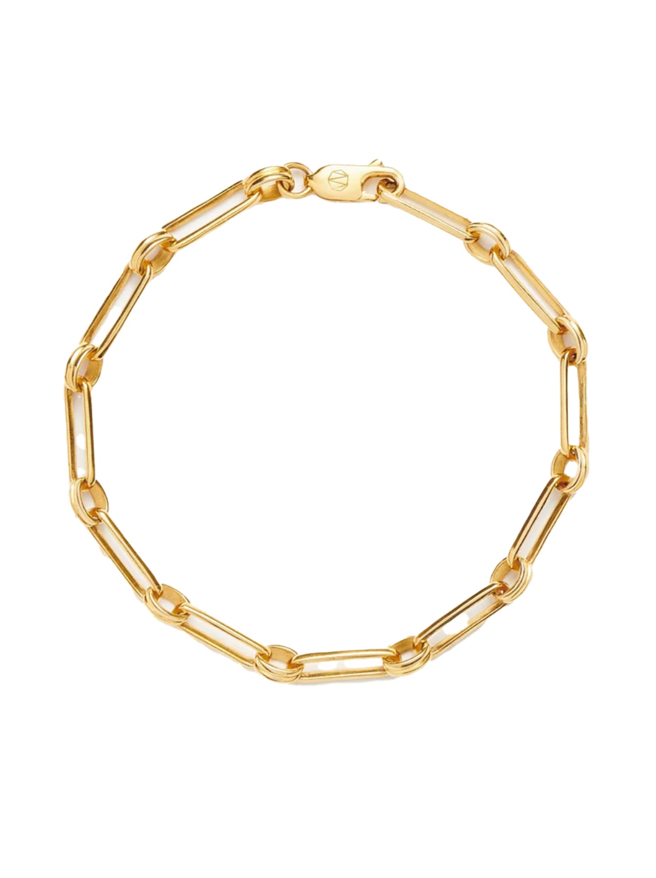 The Aegis Bracelet from Missoma will become your everyday must-wear piece. With its interlocking links, inspired by strong and stable bonds, this 18ct gold plated rectangular and oval combination chunky design can be worn on its own or added to your summertime arm stack.