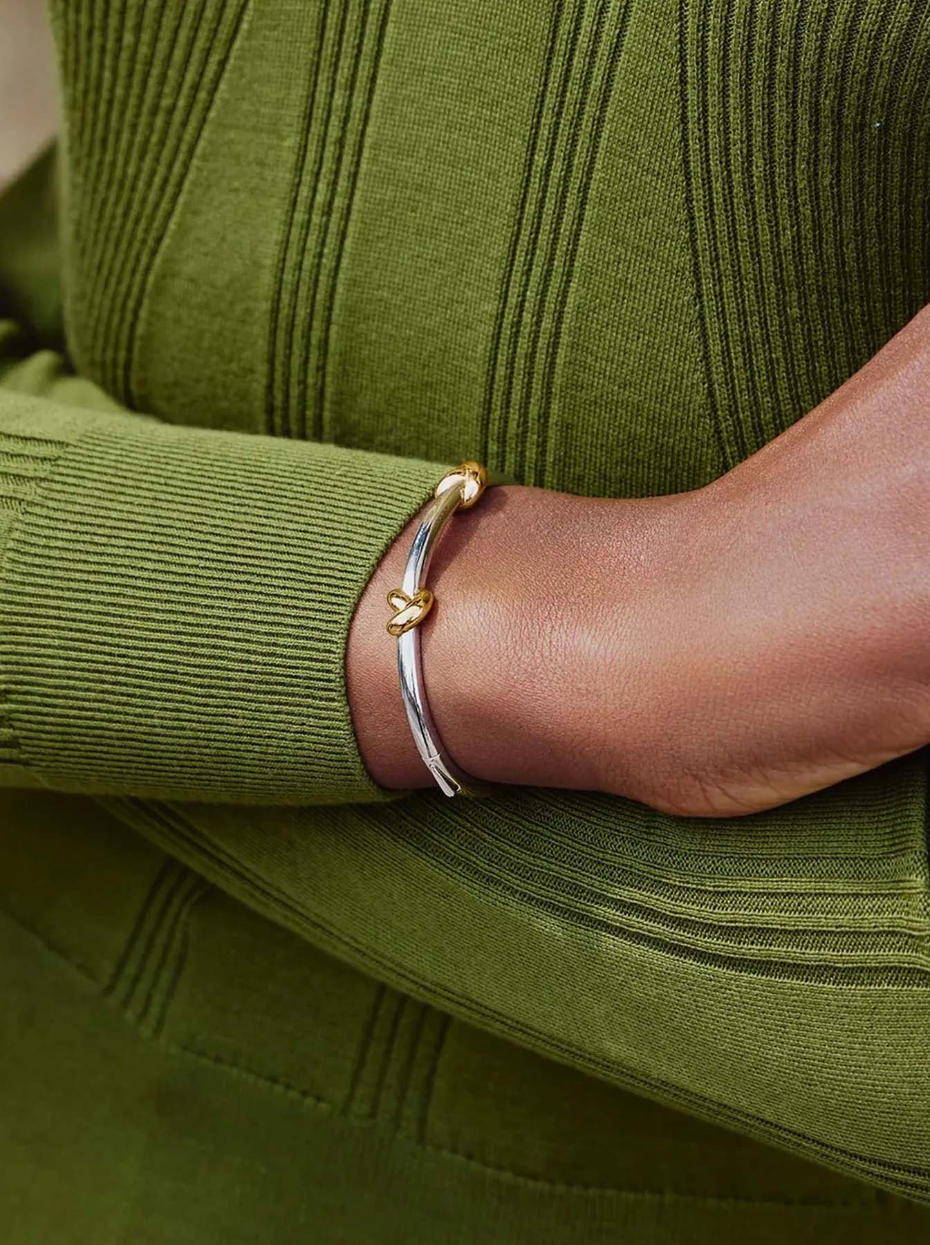 • Design: Mixed-metal hinged bangle with tactile knot feature