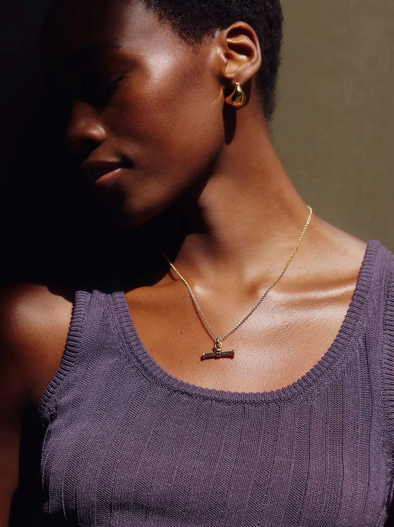 Missoma’s Mini Ridge T-Bar Necklace is an elegant everyday piece defined by its distinctive ridge-textured bar pendant. Designed for versatility, it layers effortlessly with longer chains or makes a refined statement worn solo.