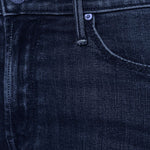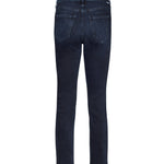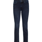 - Details: Mid-rise dark high stretch blue denim with slight fading/whiskering, with slim straight leg silhouette, classic five-pocket design, belt loops, monotonal stitching, concealed zip-fly, and finished with a clean hem