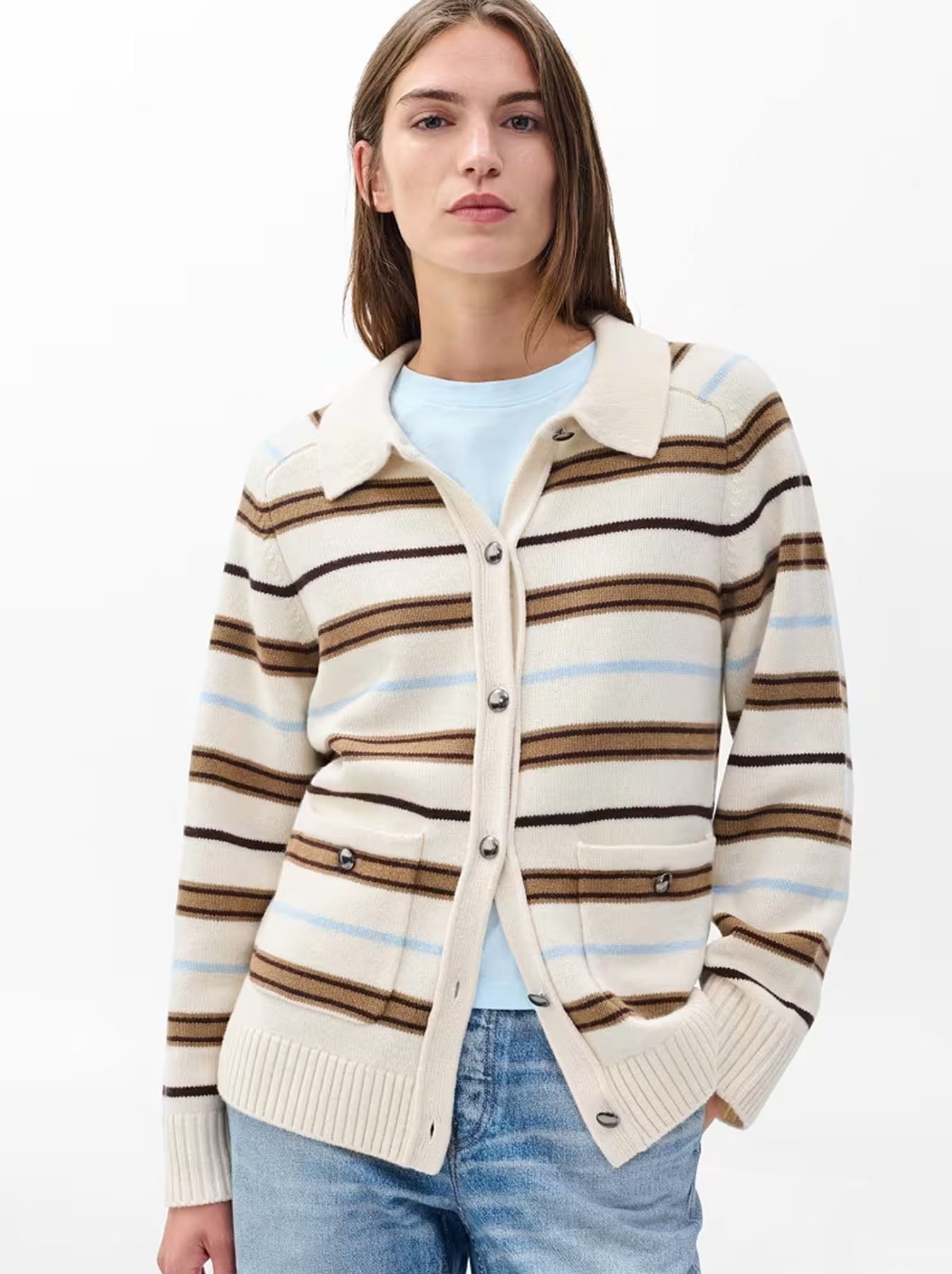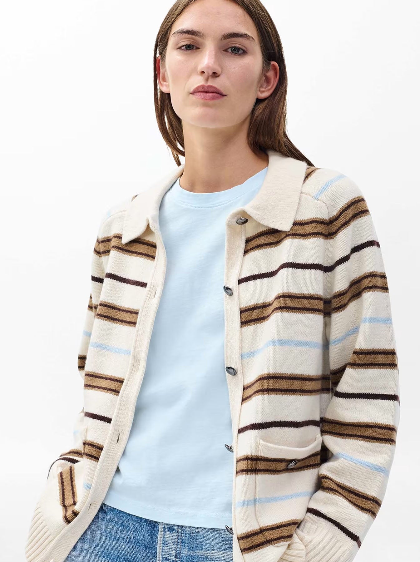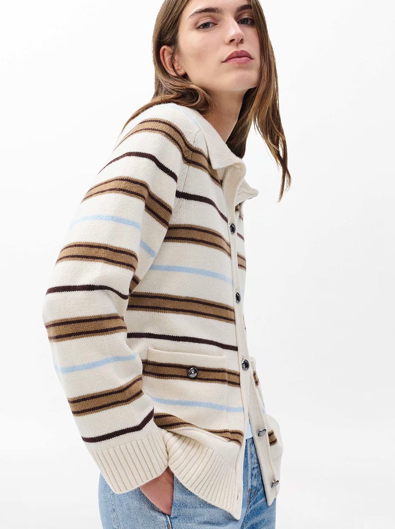 Elevate your everyday wardrobe with this soft wool cardigan that effortlessly bridges the gap between cozy knit and polished outerwear. The relaxed oversized silhouette and eye-catching stripes create an undeniably cool, laid-back aesthetic, while substantial domed metal buttons add refined detail. Crafted from premium wool, it's the versatile layer you'll reach for constantly. Note: This piece runs generously sized, so sizing down ensures an optimal fit that flatters.