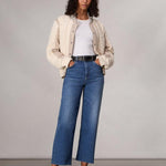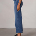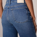 Details: Classic 5-pocket style, high-waisted stretch wide-legged denims, with cropped inseam and frayed hem that hits above the ankle in a medium blue indigo wash with fading and white leather logo placket on back of waist.