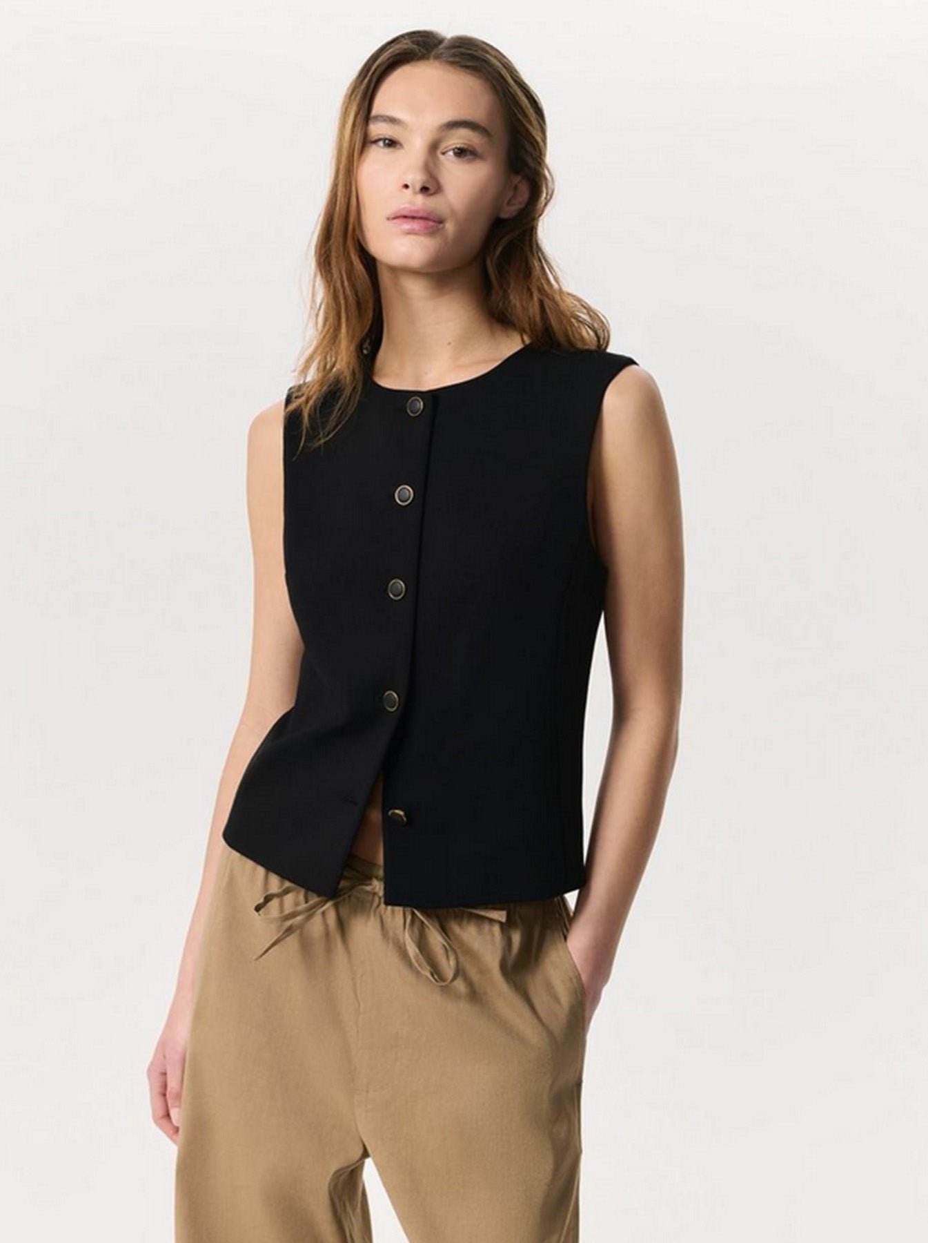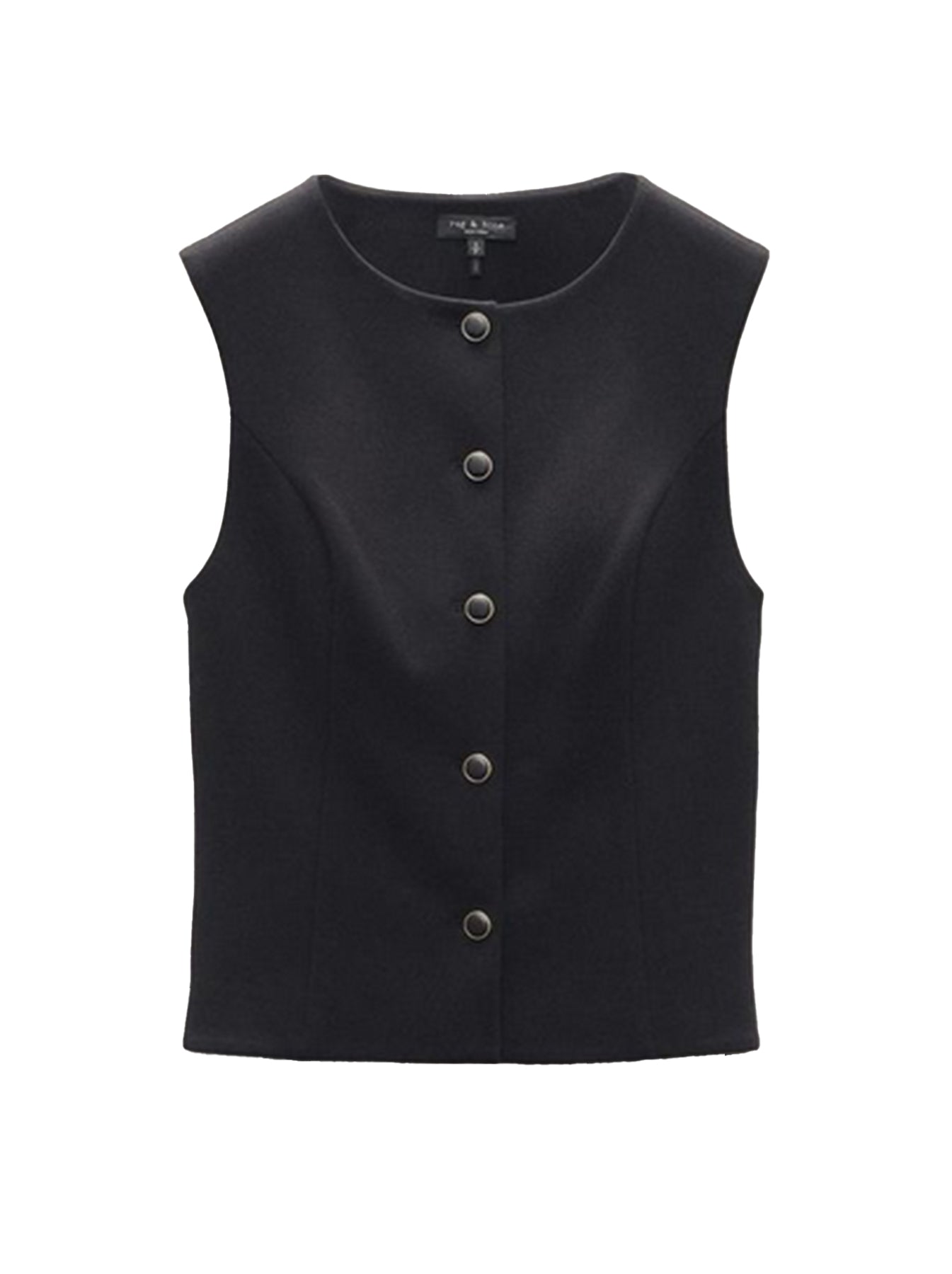 The Irina Button-Up Vest from Rag & Bone puts a fresh spin on classic tailoring. Made from a soft, stretchy knit that blends structure with comfort—it’s designed to keep you polished from work to weekend. The sleek silhouette is finished with metal-rimmed buttons for a subtle touch of elegance. Elevate your office look by pairing this with wide-leg suit trousers and heels.
