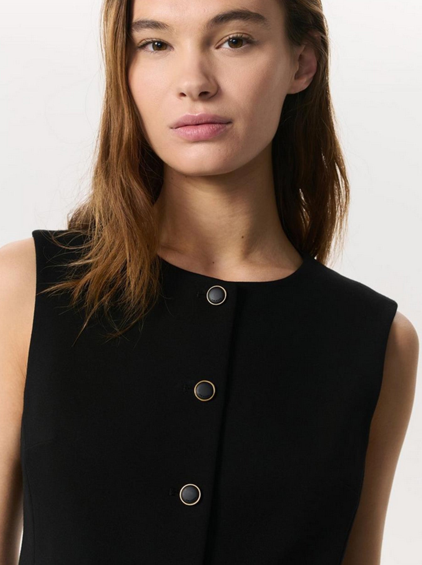 Details: Soft knit vest with a high neckline, cut-off sleeves, hip-length body, and silver-toned button front placket.
