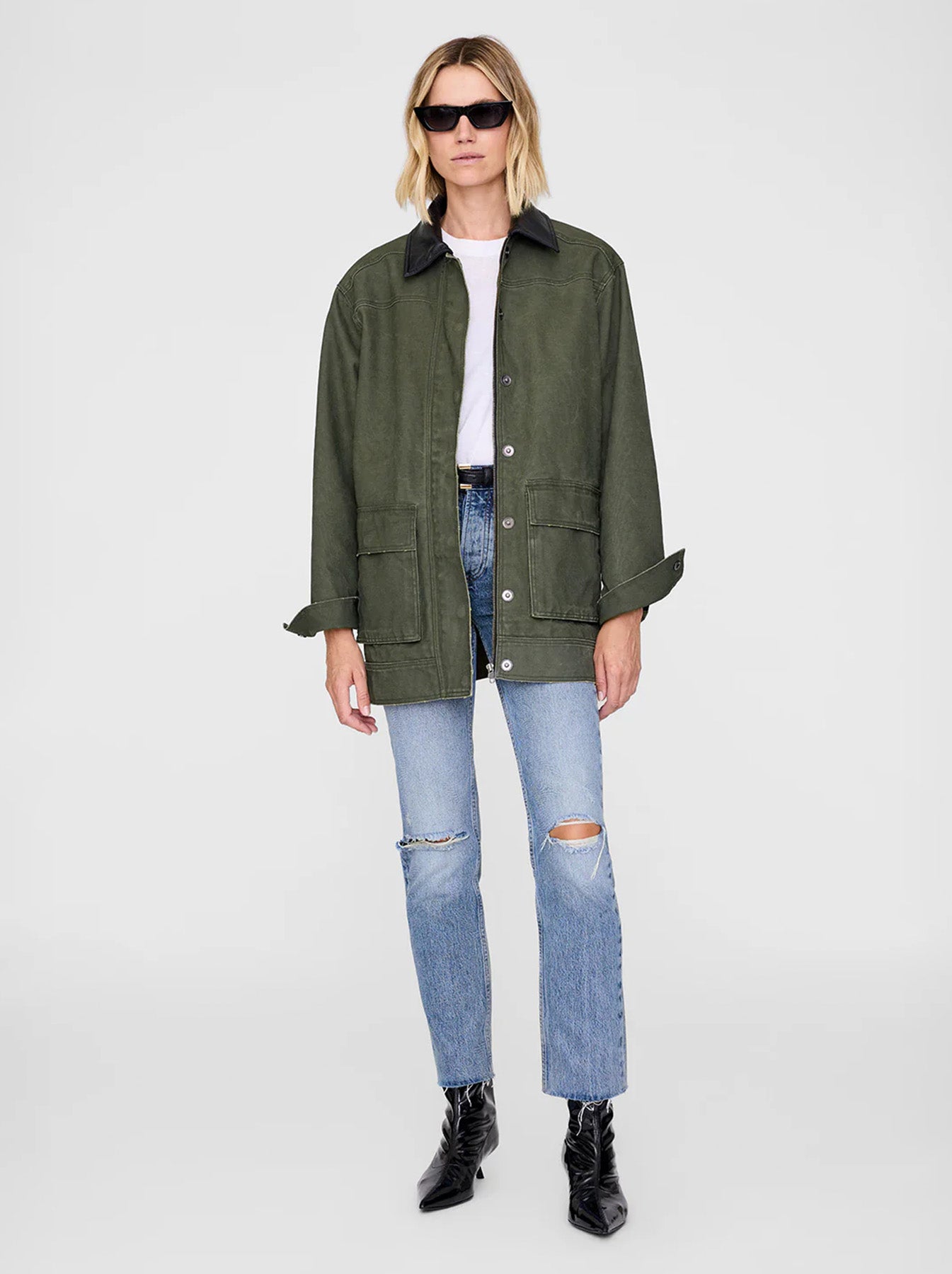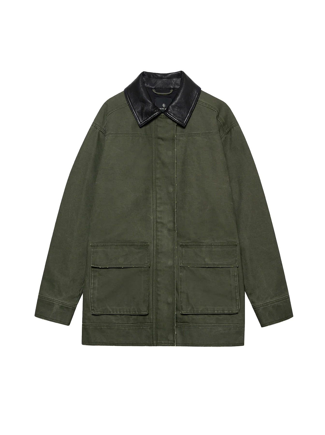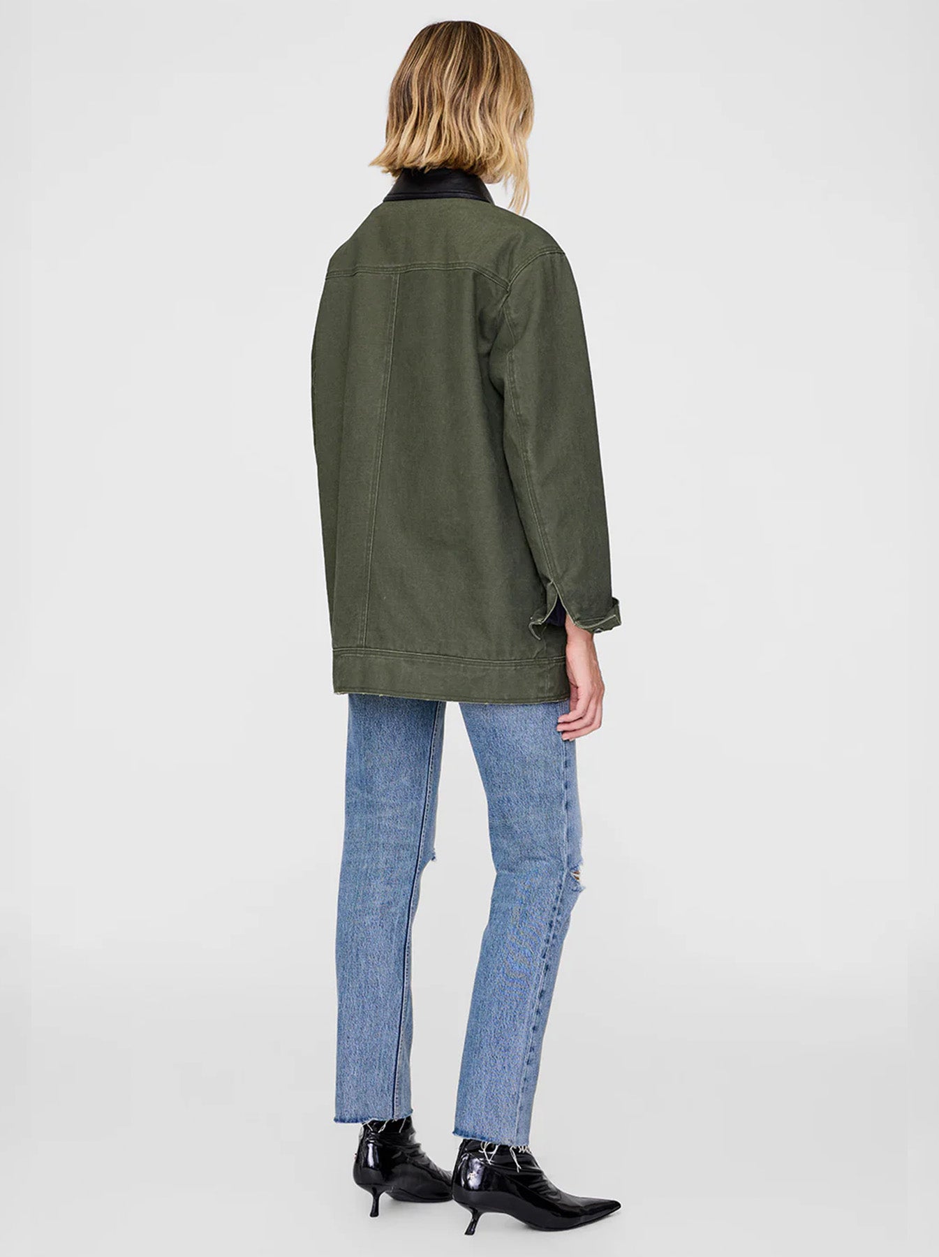 This oversized Sean barn jacket from ANINE BING features durable midweight 100% cotton canvas and a fully lined interior for added comfort. It includes a faux leather collar, a front zipper concealed by snap closures, snap-button cuffs, and two flap pockets positioned at the hips—combining practicality with classic style.