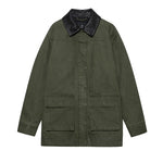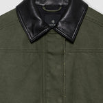 - Details: Oversized fit, faux leather collar, front zipper concealed by snap closures, snap button cuffs, two flap pockets, full lined