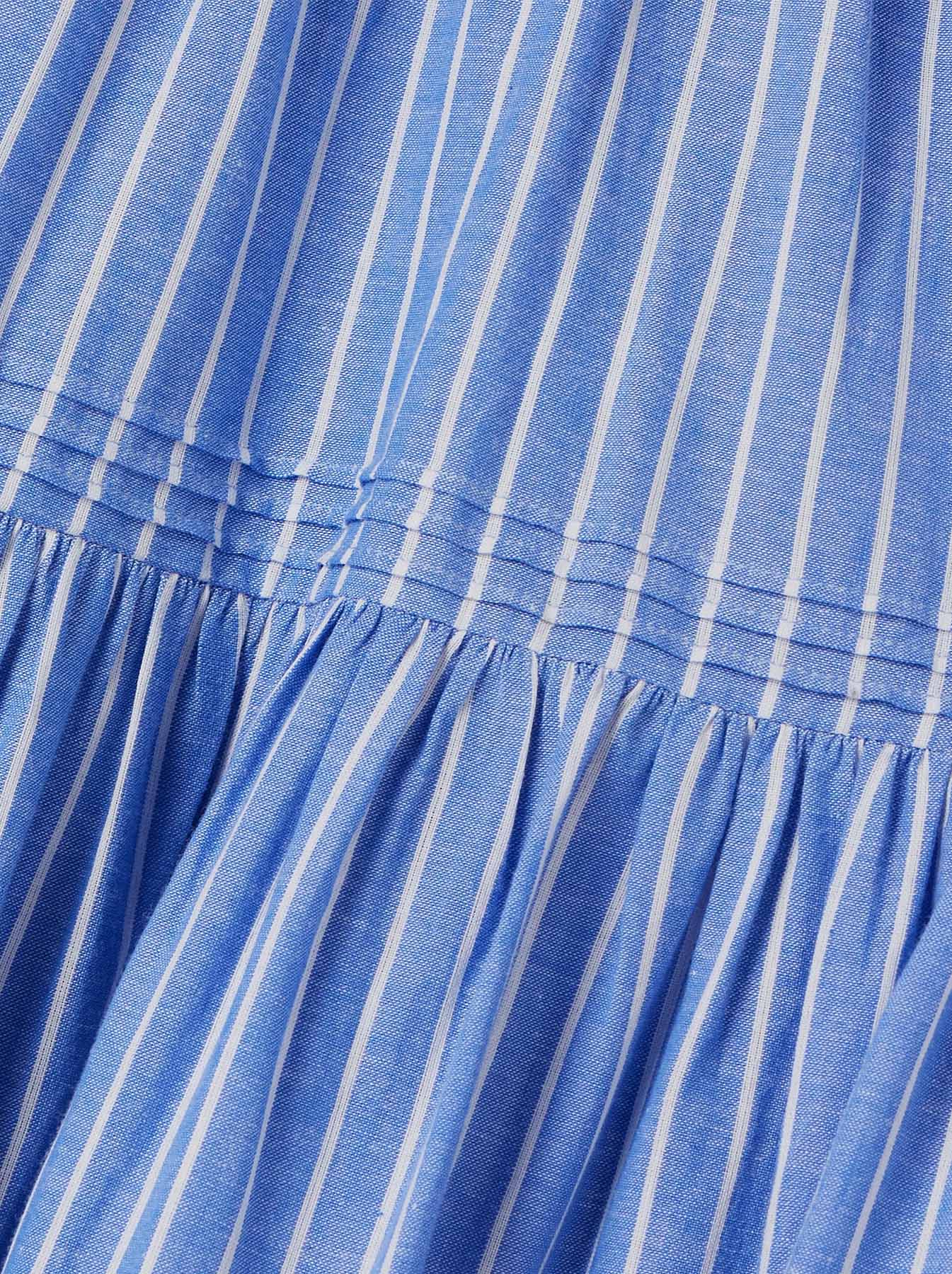 • Details: Tiered midi skirt with gathered tiers, striped, subtle crochet-trim hem, side zip and hook fastening