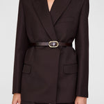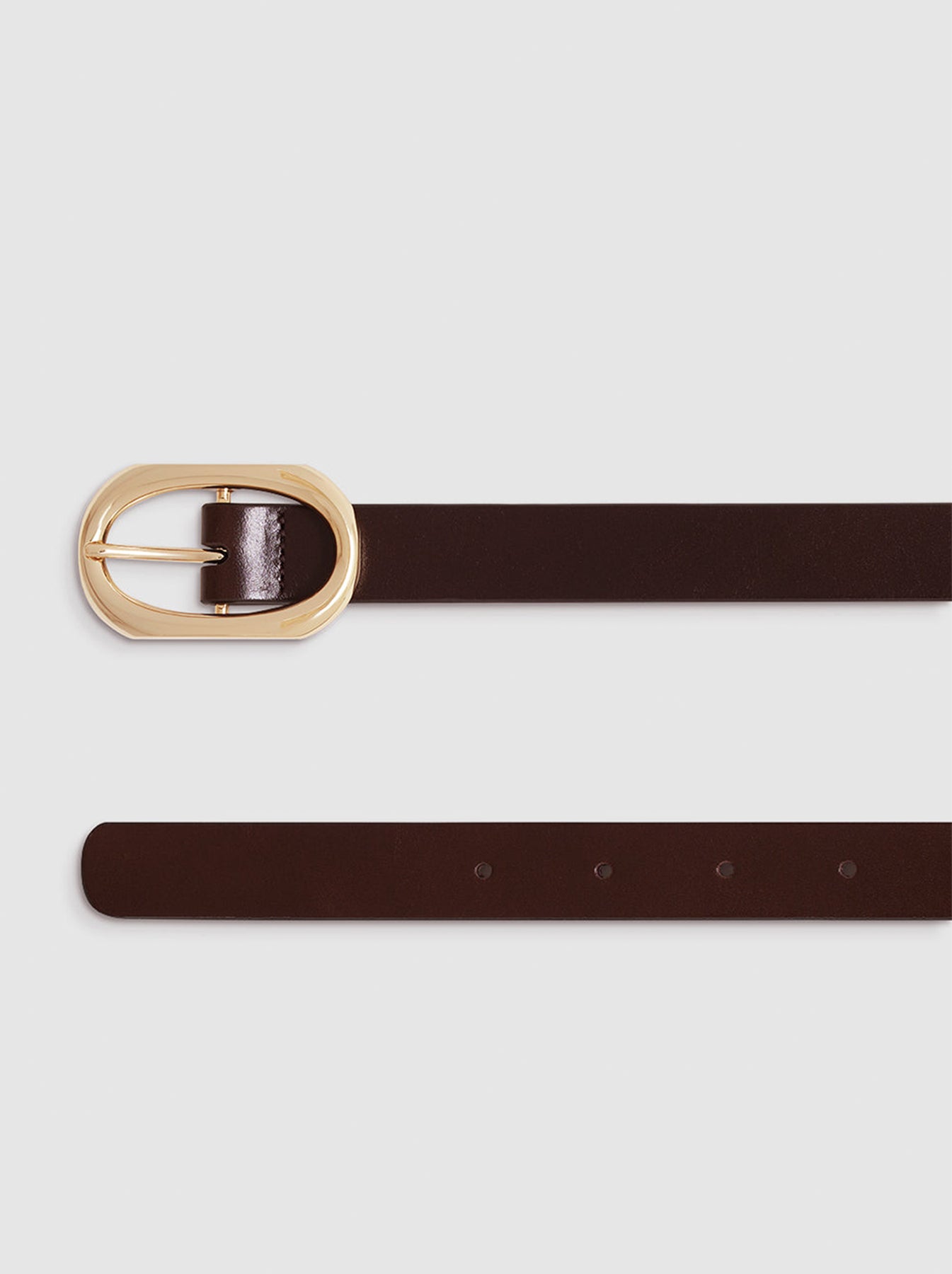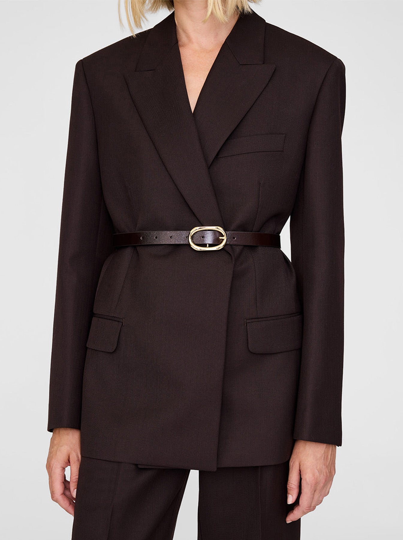 Anine Bing's Small Signature Link Belt in dark brown is crafted from 100% cow leather with a smooth finish. A 14k gold-plated link-shaped buckle brings a refined touch.