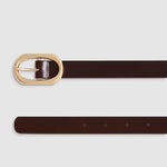 - Details: Smooth finish 100% cow leather belt, accented by a unique 14k gold- plated link-shaped buckle