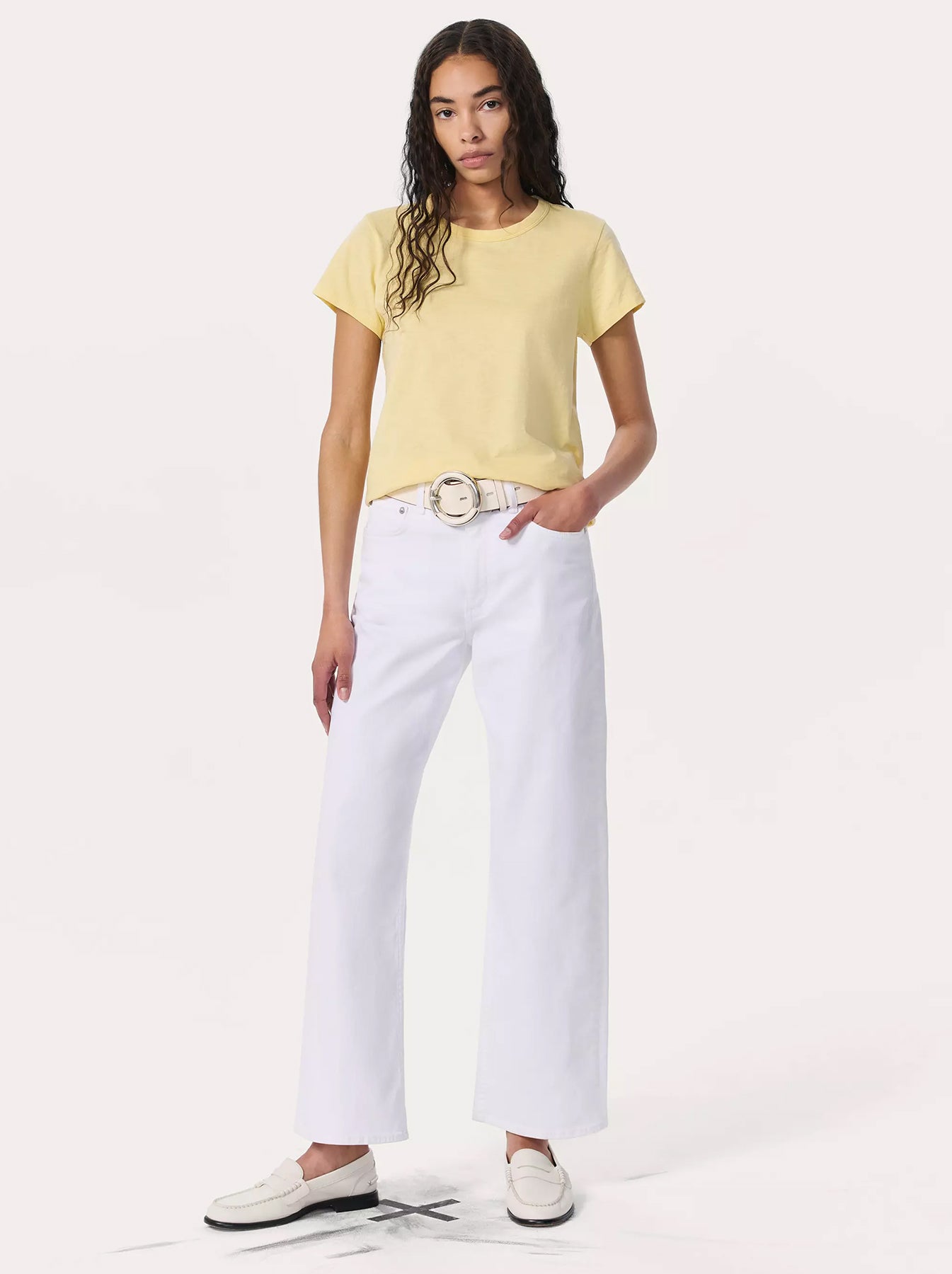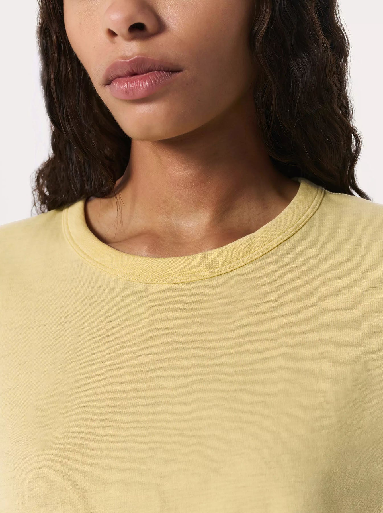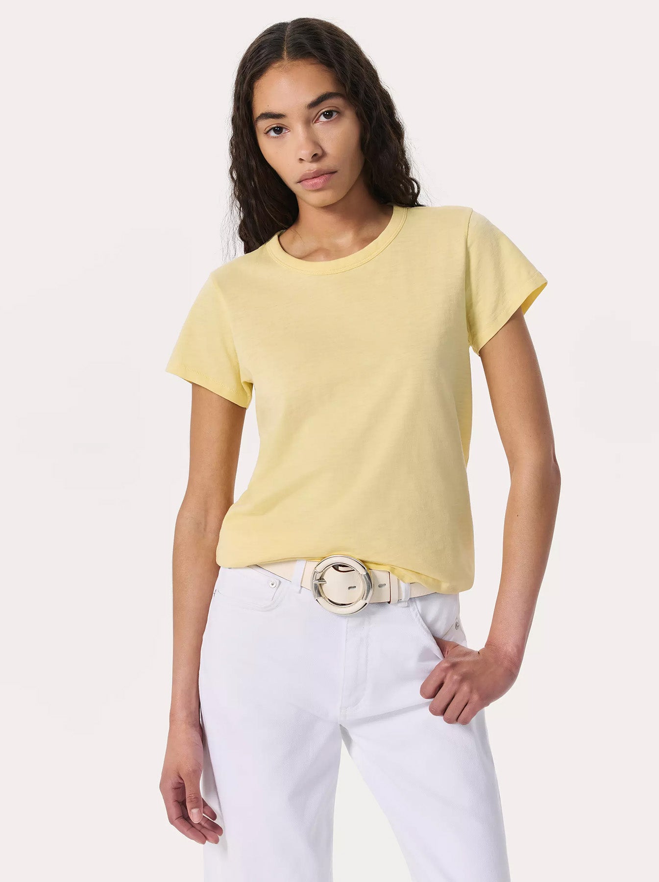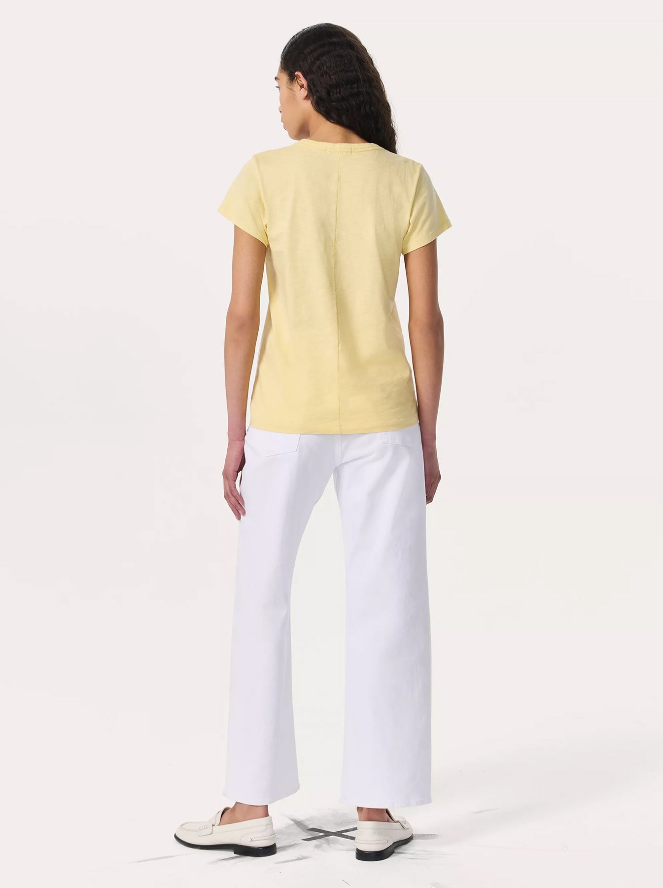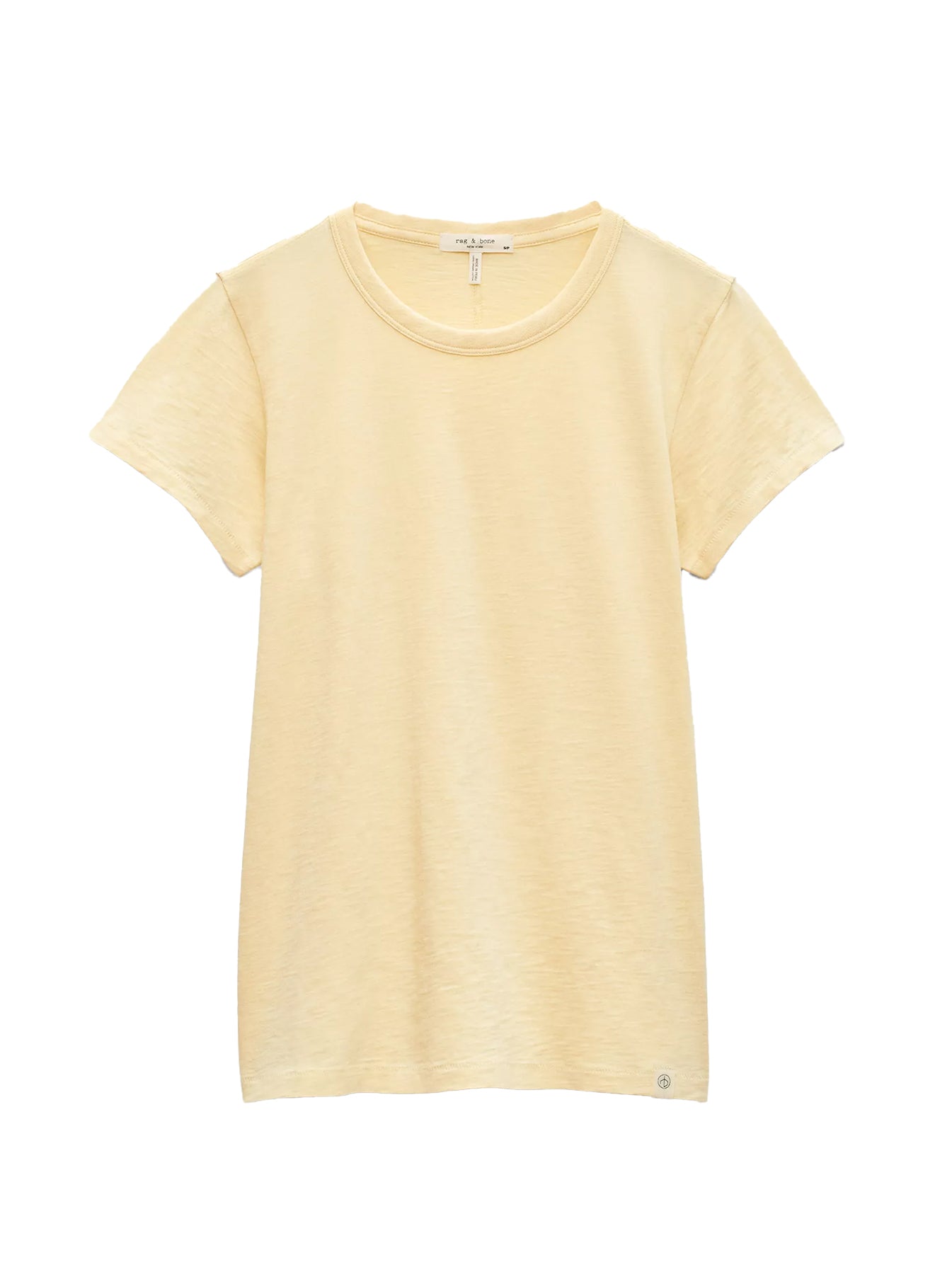Rag & Bone's Slub Crew Neck Tee in yellow is a classic that has been made to last season after season. With a crew neck and slim fit, it is the ultimate layering piece and the centre back seam ensures that it keeps it's shape. This tee pairs so well with white or pale blue jeans.