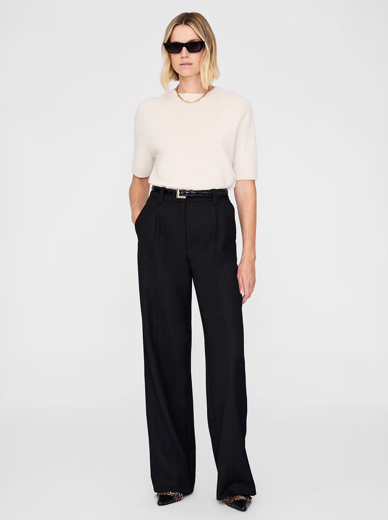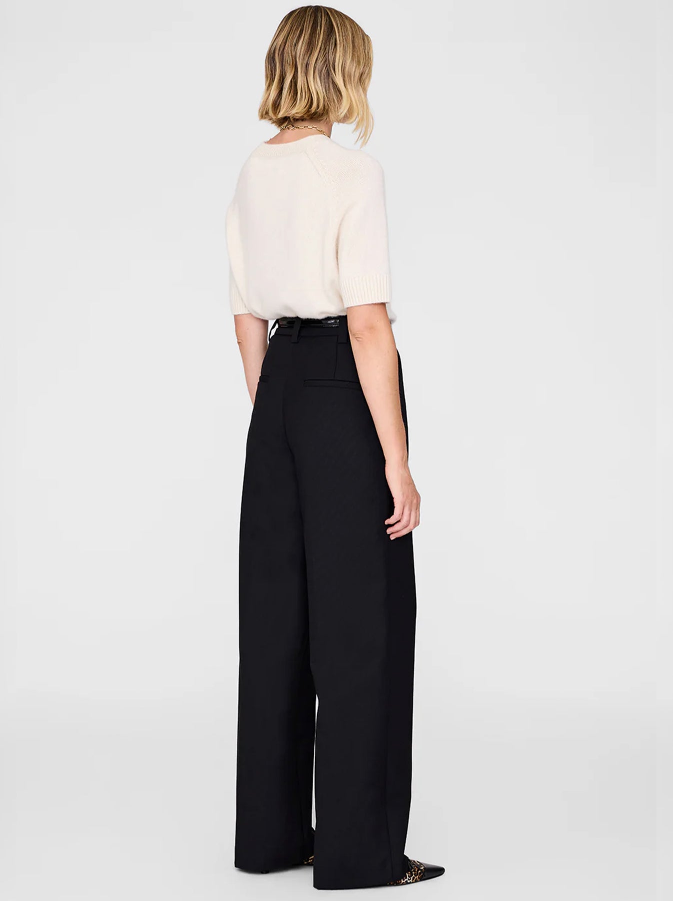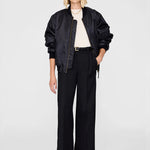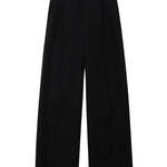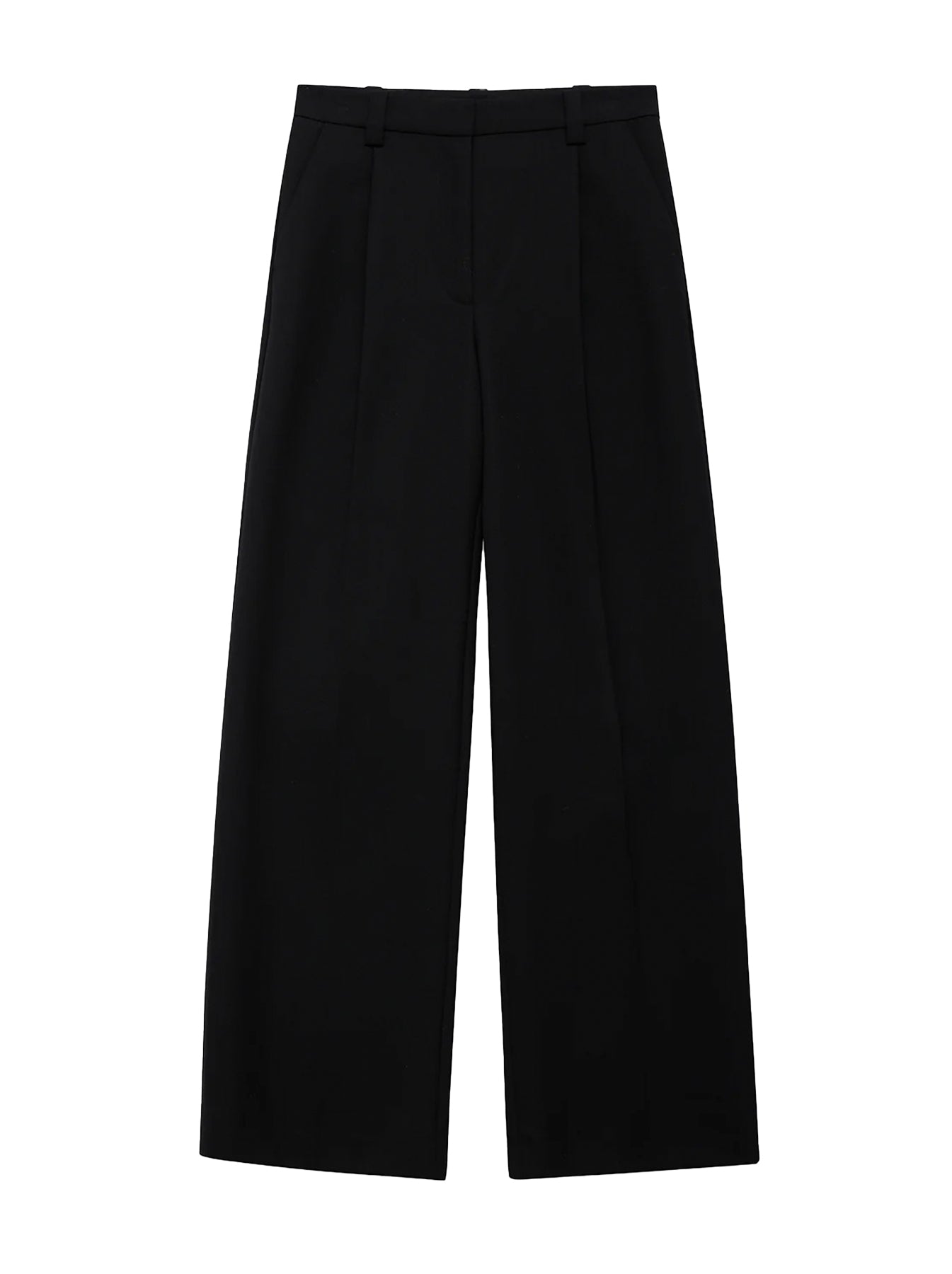 The Trent Trouser brings a modern ease to classic tailoring, cut in a midweight textured wool blend that lends depth and drape to its black suiting finish. Designed with a relaxed, low-to-mid rise and a long, wide leg, it balances structure and fluidity. Pleated detailing, functional belt loops, and slanted front pockets refine the silhouette, while a half lining to the knee ensures smooth, comfortable wear. Finished with a clean front zip and hook-and-bar closure, it delivers timeless polish with everyday versatility.